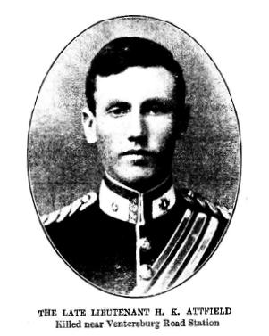 LIEUTENANT HARRY KERR ATTFIELD was killed in the fighting near Ventersburg Road Station. "His death", says Lord Roberts, "is a great loss. he has been more than once brought to my notice for gallant conduct by Kelly-Kenny." Lieutenant Attfield joined the Derbyshire Regiment as a second lieutenant a little more than four years ago, and became lieutenant in February, 1898. Before the present campaign her served with the Turah Expeditionary Force in 1897-98, and had the medal and two clasps for his services.